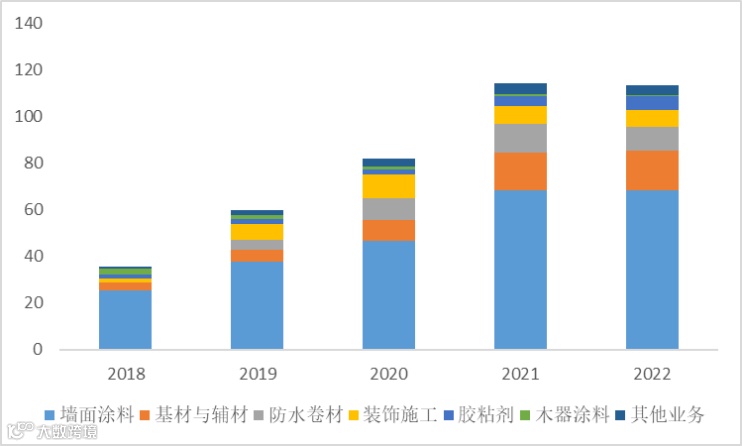 2022年营收113.38亿元,比2021年略有下降,主要是下游需求不振,工程墙面漆、防水卷材收入减少。