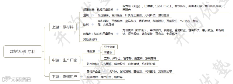 中游——建筑涂料生产厂家,代表厂家有立邦、多乐士、三棵树、亚士创能等。