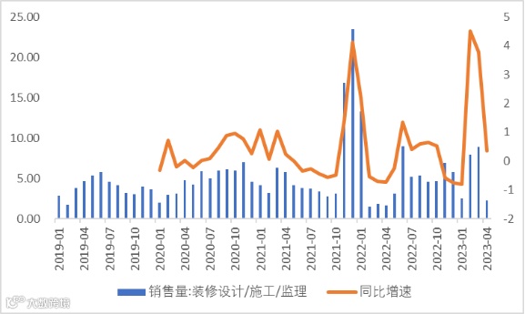 图:装修设计/施工/监理销售量(单位,万件/月,%)