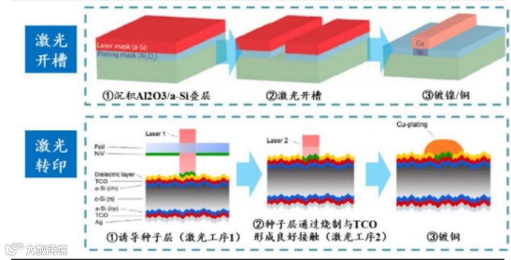 激光转印则是直接将种子层诱导至太阳能电池上,通过镀液调整电极形貌大小,适用于HJT电池(现已在PERC电池的铜电镀中得到了优化和证明)。激光转印具有高精度、无污染等优点,但成本较高,且生产速度相对较慢,目前还不能满足大规模生产的需求。