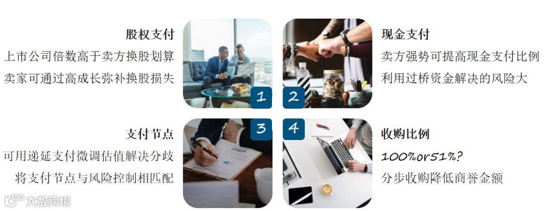例如卖方如果偏好现金,会在交易结构中尽量安排现金支付;买方认为标的未来的经营有重大不确定性或风险比大,会在交易结构设计时考虑分步购买或分期支付的方式;交易各方对交易价格及标的资产未来的盈利能力存在较大分歧时,可以在交易结构设计时安排对赌条款;当买方担心交易完成后标的资产核心人员离职,我们可以在交易结构设计时加入核心人员离职补偿条款及竞业禁止条款。