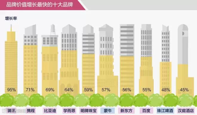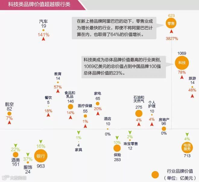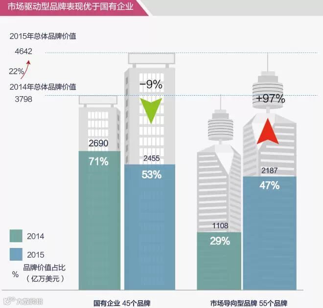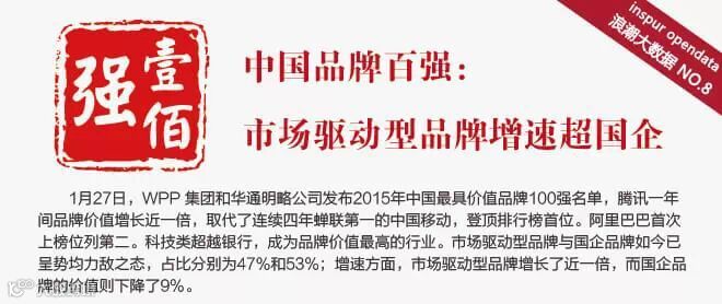 1月27日,WPP 集团和华通明略公司发布2015年中国最具价值品牌100强名单,腾讯一年间品牌价值增长近一倍,取代了连续四年蝉联第一的中国移动,登顶排行榜首位。阿里巴巴首次上榜位列第二。科技类超越银行,成为品牌价值最高的行业。市场驱动型品牌与国企品牌如今已呈势均力敌之态,占比分别为47%和53%;增速方面,市场驱动型品牌增长了近一倍,而国企品牌的价值则下降了9%。