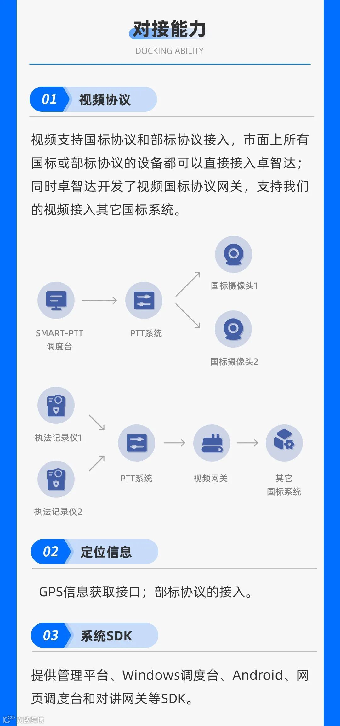 REALPTT系统新增室内定位应用,工作流应用,优化巡更2.0应用,对接国标GB28181协议,对接部标协议。对讲业务增加进组围栏、丢失报警、调度台设置手持终端等功能,以适应行业定制化需求,尤其针对公共安全行业提供更加完善的对讲通讯服务。