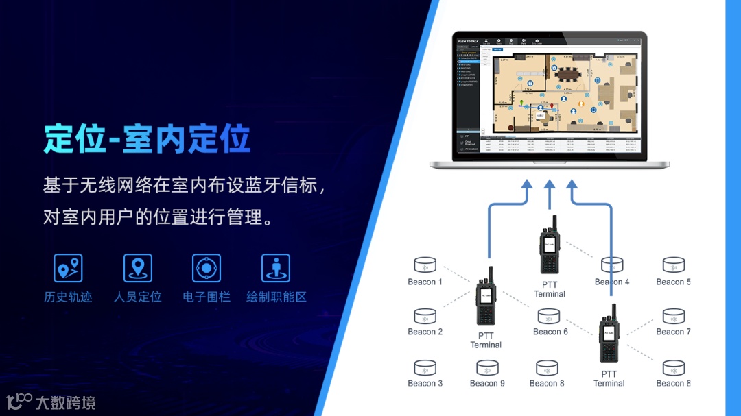 基于无线数据网络在室内布设蓝牙信标,对室内用户的位置进行管理。被定位区域布设好蓝牙信标,通过测量PTT终端位置与蓝牙信标距离关系,获得PTT终端的位置,定位精度可达到米级定位(5米以内)