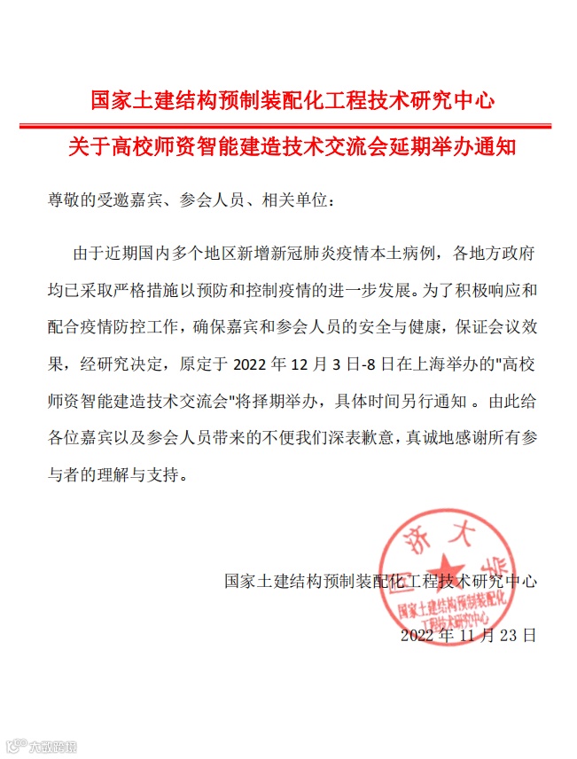 由于近期国内多个地区新增新冠肺炎疫情本土病例,各地方政府均已采取严格措施以预防和控制疫情的进一步发展。为了积极响应和配合疫情防控工作,确保嘉宾和参会人员的安全与健康,保证会议效果,经研究决定,原定于2022年12月3日-8日在上海举办的"高校师资智能建造技术交流会"将择期举办,具体时间另行通知。由此给各位嘉宾以及参会人员带来的不便我们深表歉意,真诚地感谢所有参与者的理解与支持。