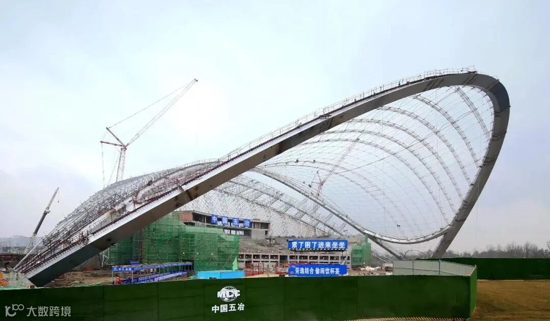 在施工中,创新建立了考虑综合施工缺陷影响的非线性施工力学分析、预测、评价方法;研发了大跨度钢斜拱安装控制技术、索网提升张拉与斜拱协同卸载技术、安防装置动力设计方法、外倾双曲肌理幕墙施工工艺;开发了全流程施工协同管理系统,研发的数据轻量化技术提高效率20倍。
