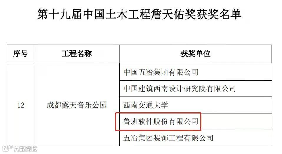 2022年1月12日,中国土木工程学会公布了第十九届中国土木工程詹天佑奖获奖名单。由中国五冶集团有限公司、鲁班软件股份有限公司、西南交通大学等单位联合申报的“成都露天音乐公园”项目在列,荣获詹天佑奖!