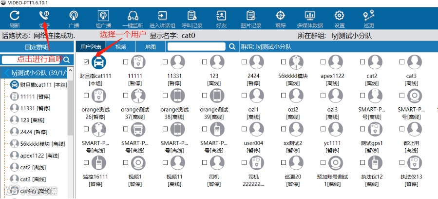 在调度台当前群组中,勾选单个用户进行直接呼叫,只发不应,只有被直呼的用户才能听到调度台讲话的语音,群组其他成员接收不到。