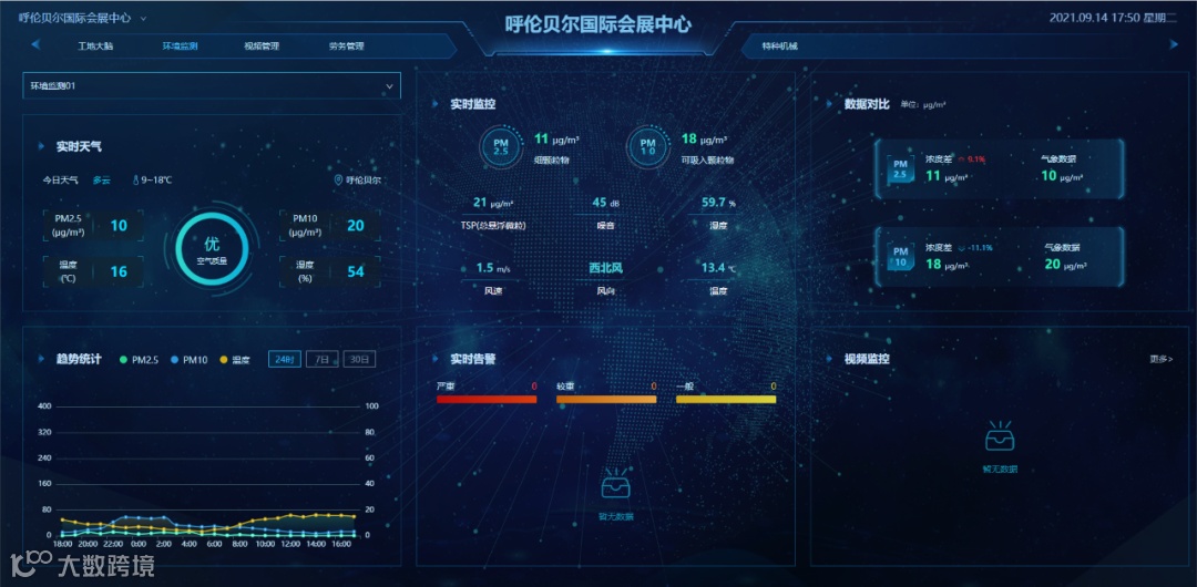 鲁班智慧工地环境监测功能可以实时监测现场测量点处的扬尘数据,包括PM2.5、PM10、温度、湿度、风速等参数,当监测到参数异常时,立即发出告警并采取相应措施。呼伦贝尔国际会展中心项目安装环保除尘雾炮机、落实扬尘噪声在线监测系统和场界围墙喷淋降尘系统全覆盖,实现智能环境监测,做好区域绿化工作。