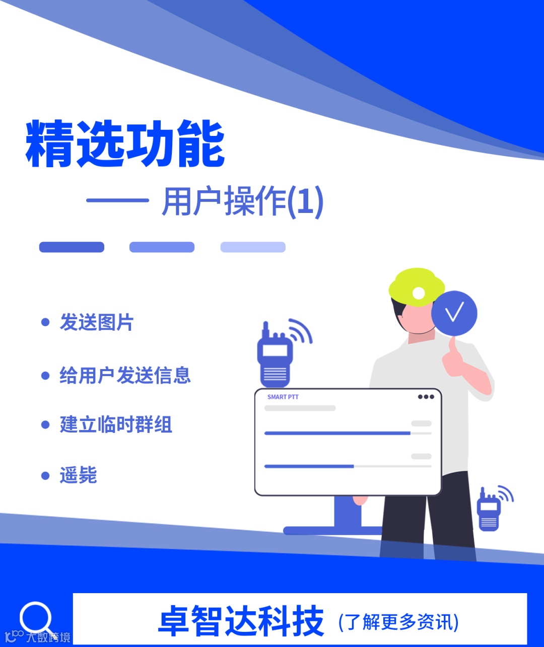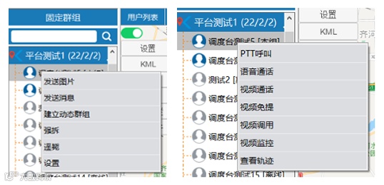 选中在线用户右键操作有:发送图片、发送信息、建立动态群组、强拉、强拆、遥毙、设置(打开机器的省电模式)等;选择用户双击:PTT呼叫、语音通话、视频通话、视频免提、视频调用、视频监控、查询轨迹等。