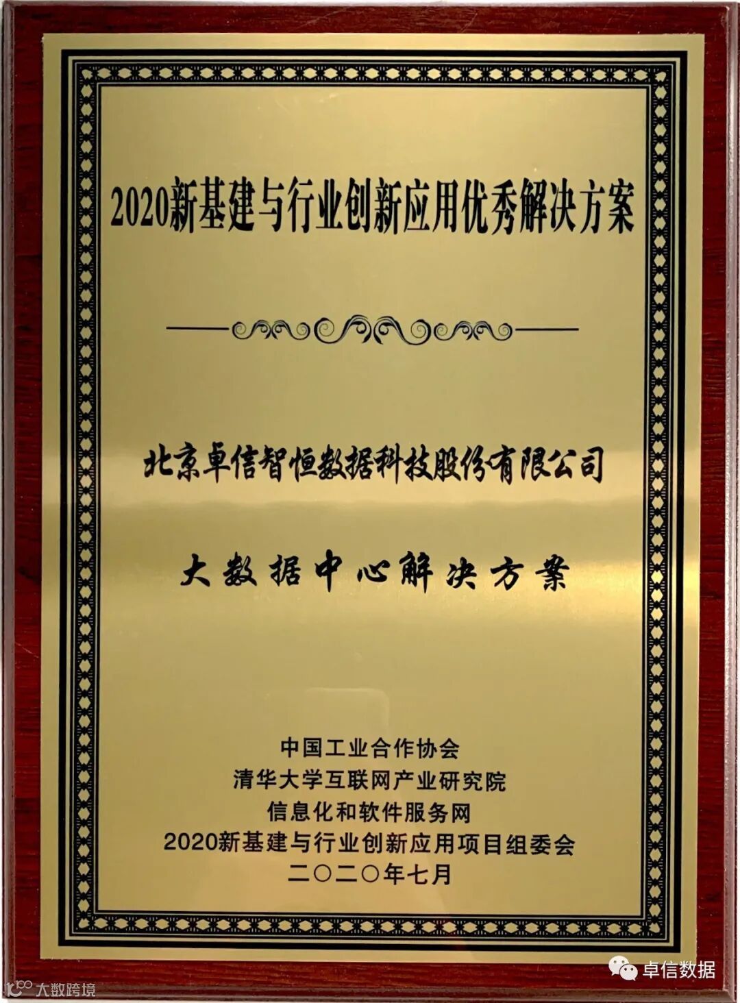 7月23日,由中国工业合作协会、清华大学互联网产业研究院、信息化和软件服务网等单位共同发起,以“闻‘基’而动产业共赢”为主题的“2020新基建优秀项目集征集”活动成果重磅发布。卓信数据大数据中心解决方案荣获“2020新基建与行业创新应用优秀解决方案”奖。