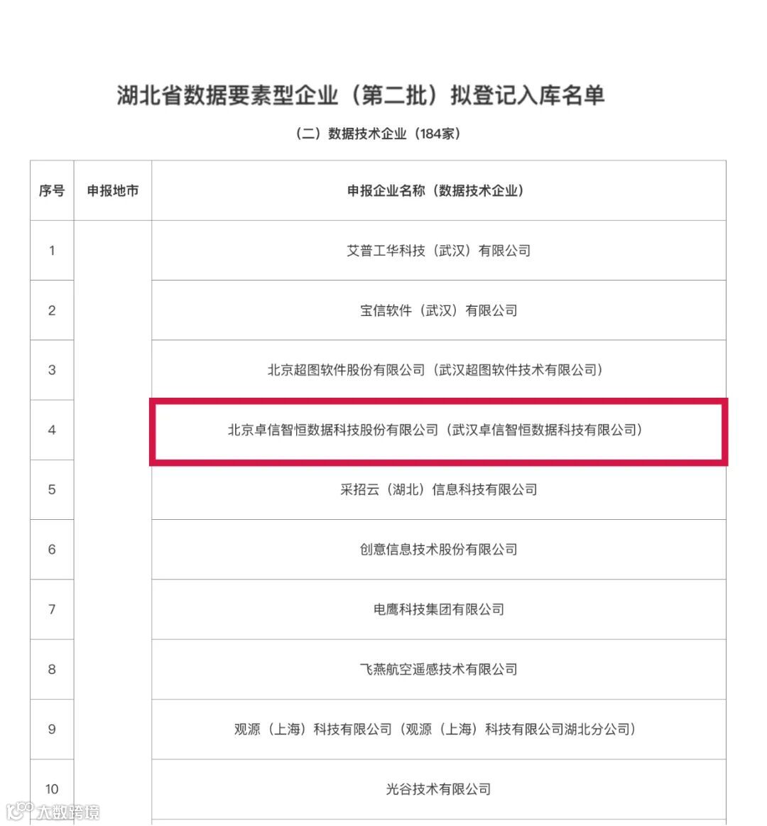 近日,湖北省数据局正式公布“湖北省数据要素型企业(第二批)”认定名单,北京卓信智恒数据科技股份有限公司凭借在数据要素领域的核心技术研发能力、场景应用创新能力及行业赋能价值,成功入选该名单,这标志着公司在数据要素市场的发展中迈出了重要一步。