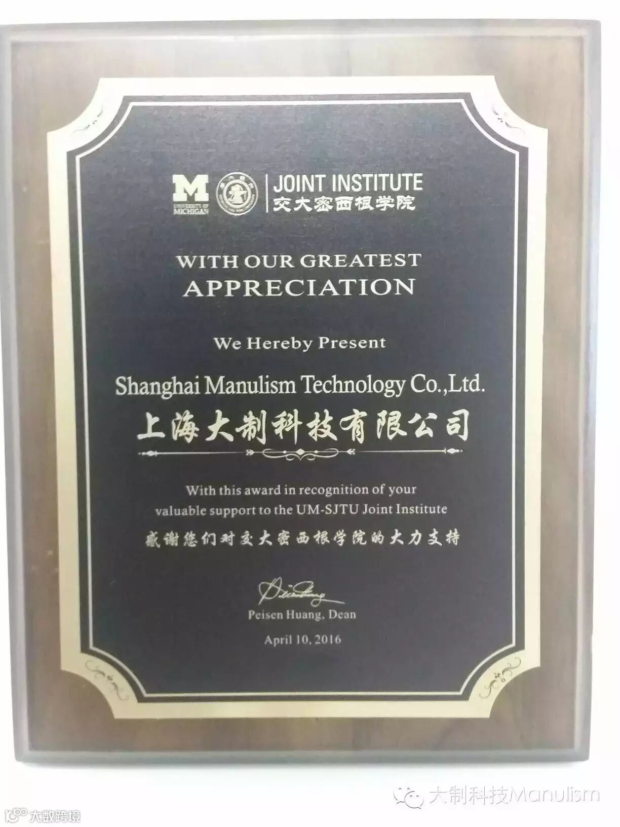 大制科技有限公司因长期同交大密西根学院交流沟通大数据方面的经验以及分享对未来工业4.0领域发展的研究成果,获得学院颁发的感谢证书