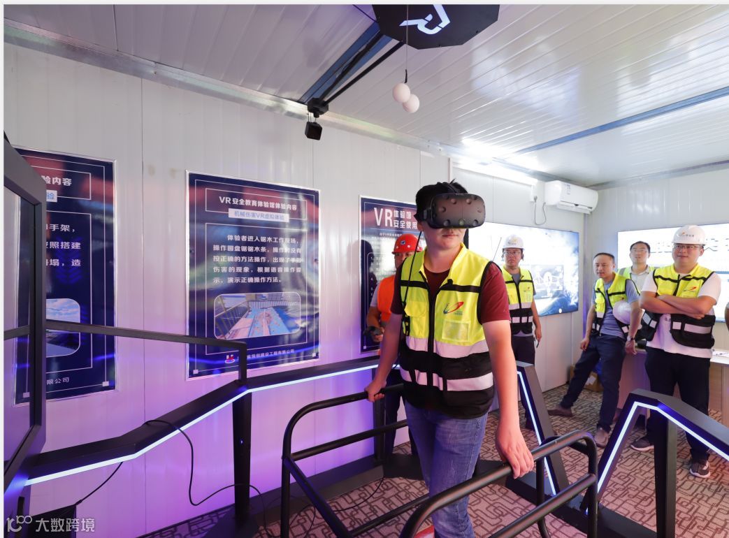 VR安全体验馆。项目在工地设置了VR安全体验馆,以三维动态的形式全真模拟出工地施工真实场景和险情,实现3D动态漫游,达到施工安全教育交底和培训演练的目的。这套VR安全体验系统可以模拟施工电梯事故、吊篮坠落事故、塔吊倾倒事故等多种施工现场常见事故,可以获得高空坠落、高空物体打击、灭火器使用、消防逃生等多种不同体验。