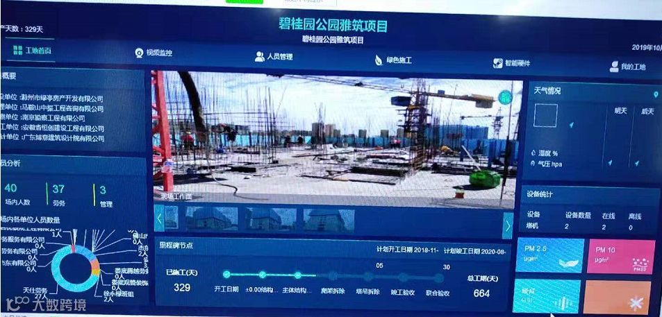 6、通过智慧工地系统可显示项目工地概况、进度、设备、人员等各环节业务数据,便于管理人员全景式的了解项目施工概况。