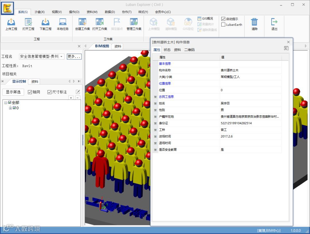劳务人员安全教育信息管理。在鲁班BIM浏览器(Luban Explorer)客户端录入工人电子身份信息,方便现场管理人员快速的获取工人基本信息、安全状态信息、进出场时间、工种等信息。同时关于此工人全部电子文档信息都已经有序的归纳,且可生成端口独有的二维码贴到安全帽上,利用鲁班移动应用(Luban View)可以随时查看人员信息,便于对现场人员进行信息化管理。