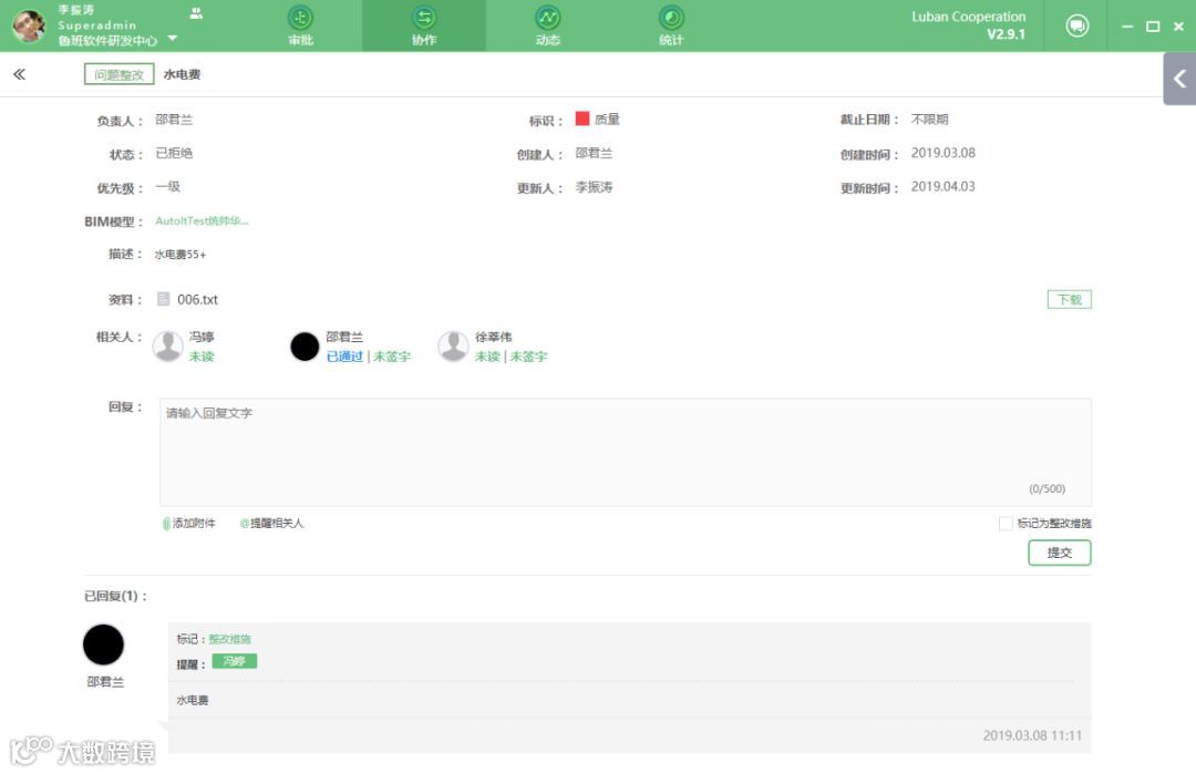 协作功能是上级对下级或平级之间任务安排。主要用于问题整改、安全隐患、质量巡检等。通过关联BIM、附件等形式,让相关人可以迅速了解问题,并展开任务。任务中的回复、照片可以让任务的发起人了解当前任务进度,做到实时把控。