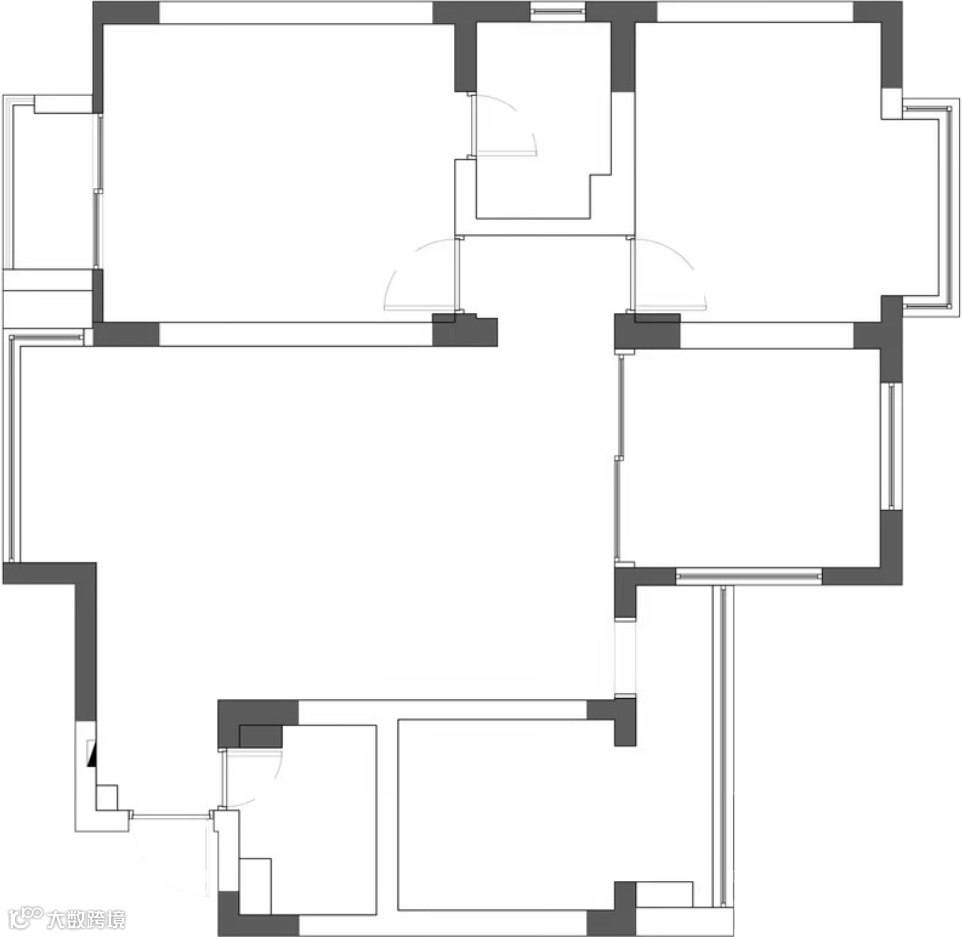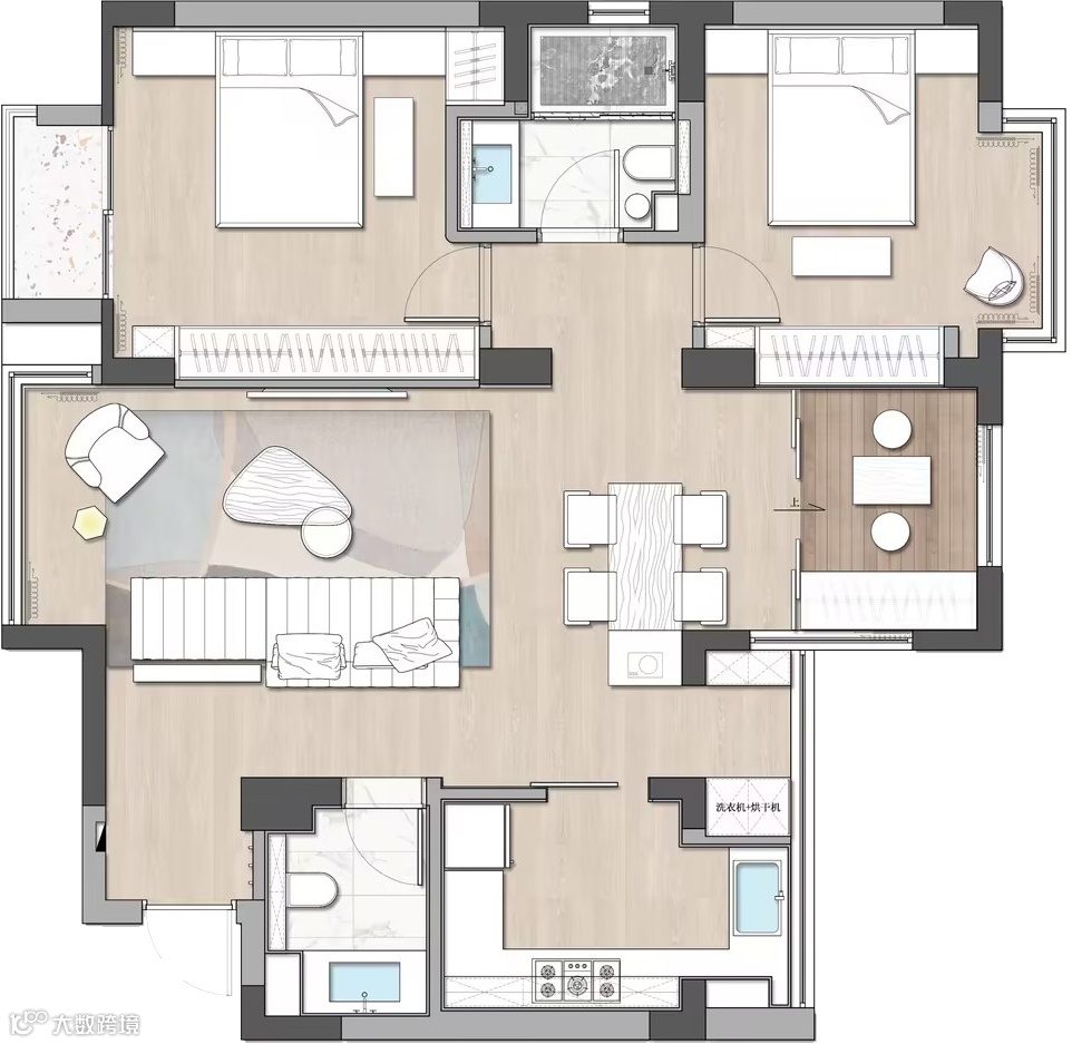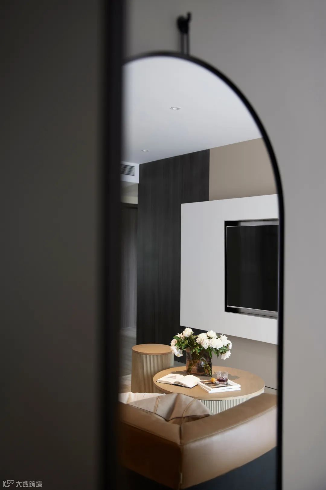 落地镜的置入,扩宽了空间的深度,使之呈现出更饱满、立体的效果,丰富了空间的层次表达。
