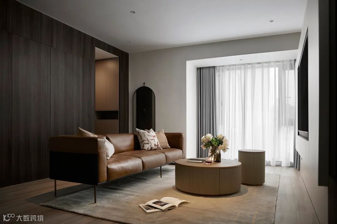 质朴厚重的木质圆形茶几自带收纳功能,将功能与美学结合得恰到好处。