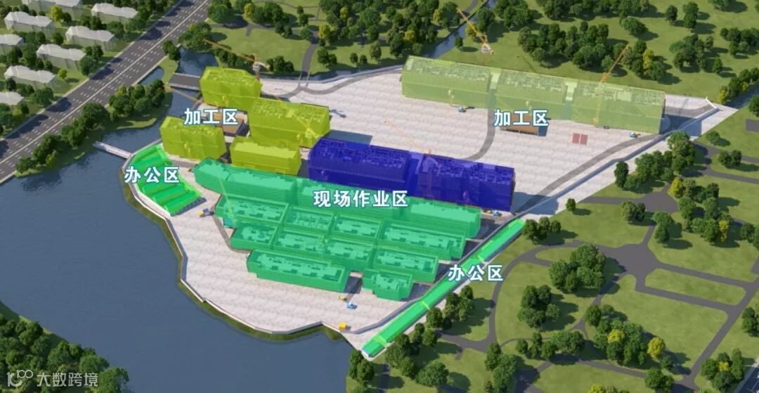 利用BIM技术——鲁班场布,因地制宜对场地进行合理布置,三维模拟设置办公区、加工区及现场作业区,进行分区动态管理。