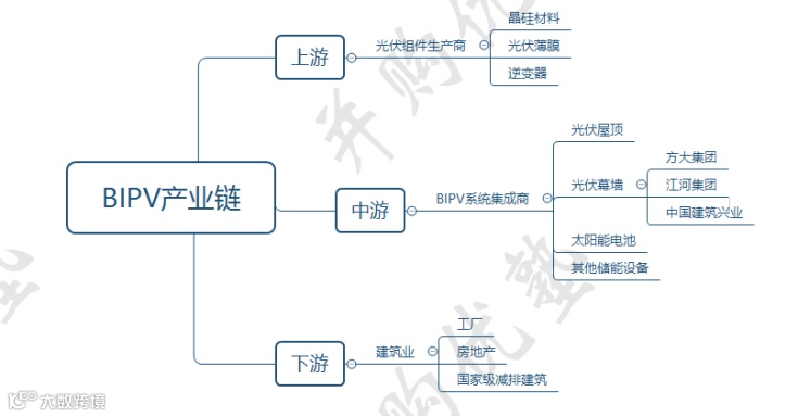 中游——BIPV系统集成商(分为光伏企业和建筑企业),主要产品包括光伏屋顶、光伏幕墙、太阳能电池和其它储能设备等,光伏幕墙代表建筑企业方大集团、中国建筑兴业、江河集团等。