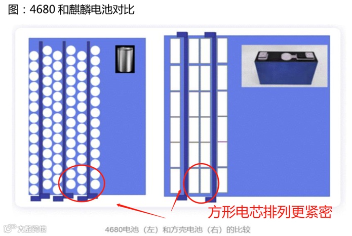 从电池包中电芯数量的角度来看,麒麟电池包中的电芯数量更多(大约多了20%-25%),能量密度也比4680高出13%。