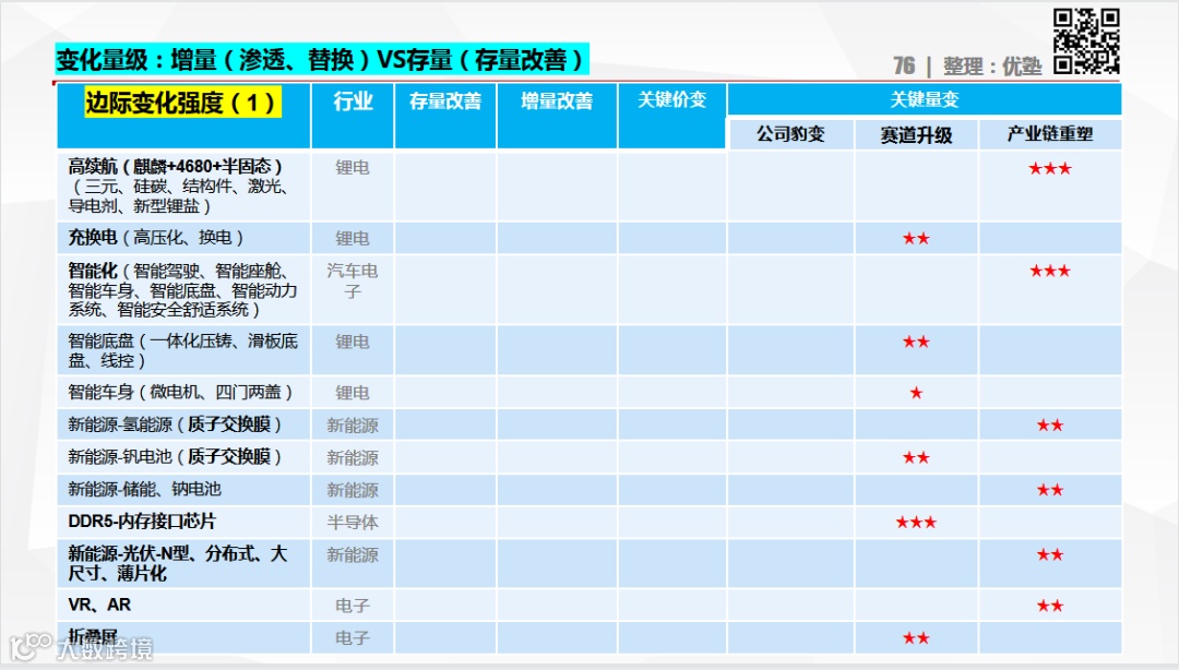1、锂电:麒麟+4680—— 动力电池 | 电解液 | 整车 | 动力总成 | 锂电结构件 | 三元正极 | 锂电铜箔 | 动力电池电池盒 | 锂电设备 | 负极材料 | 锂电正极粘结剂PVDF | 磷酸铁锂正极 | 锂电激光设备 | 碳硅负极 | 动力电池 | 三元前驱体 | 国产整车 | 锂电铝箔 | 软磁材料 | 整线设备 | 隔膜 | 锂电铜箔 | 碳纳米管导电剂 | CTX电池设备 | 充电桩 | 锂电回收 | 动力电池和储能 | 磁性元件 | 增程式电动车 | 精密结构件| 热管理 | 负极材料 | 汽车铝热传输材料 | 单晶三元正极 |球形氧化铝 | 电解液 | 镁合金结构件 | 软包电池 |