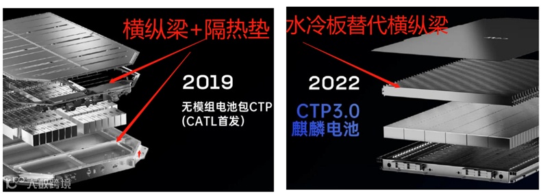 麒麟电池组——减少了电池包中横纵梁。其采用的是冷却板充当电池包的结构件,在不改变电芯大小前提下,通过省去电池包中的结构件,将省下来的体积换成电芯。