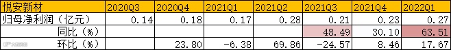 一、悦安新材——2022年Q1实现营业收入1.04亿元,同比+34.92%;实现归母净利润0.27亿元,同比+63.51%。