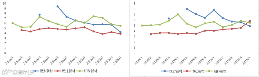 总资产周转率方面,博迁新材总资产周转率下滑较快,主要受到募集资金增长账面资产影响。
