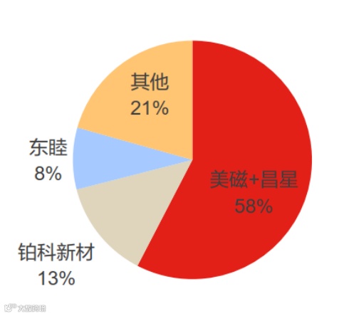 因此,金属软磁粉芯的市场格局相对稳定,其中,美磁、昌星、铂科新材三家公司的市场额份合计为71%。(龙头粉芯企业均具有自制粉体的能力)