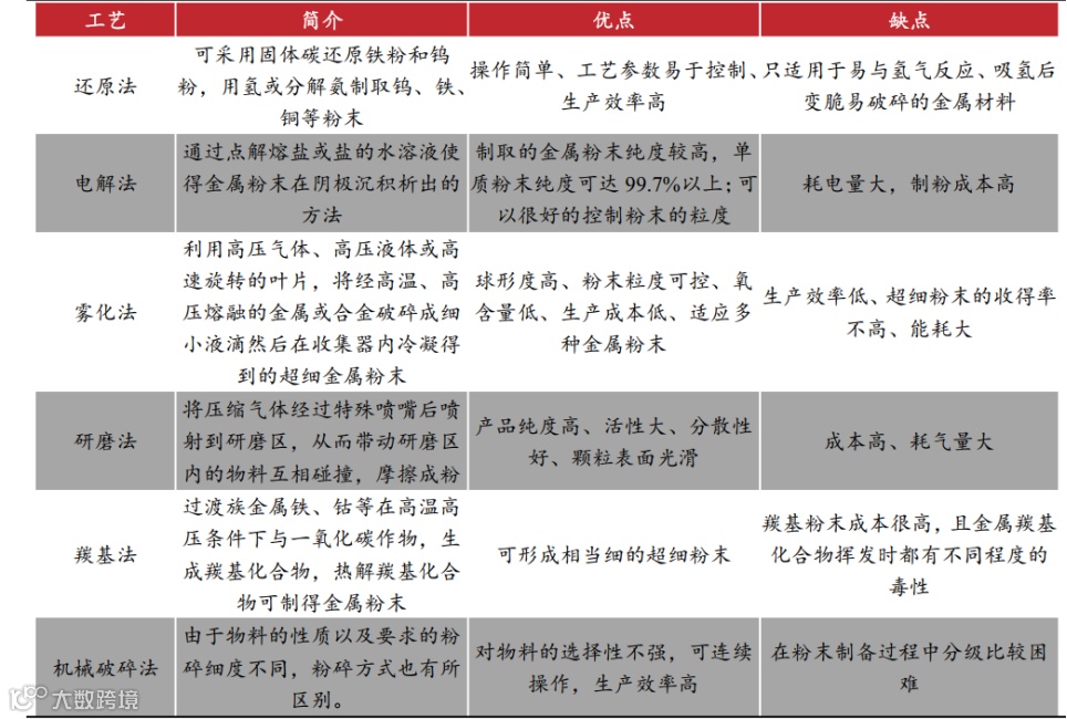 1)单质金属粉末:大多使用还原法、电解法、羰基法生产;