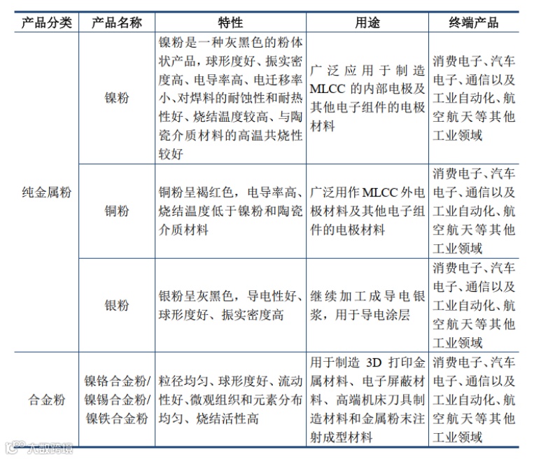 纳米镍粉主要应用于MLCC内电极材料,下游为消费电子、汽车电子、工业和通信用途等;
