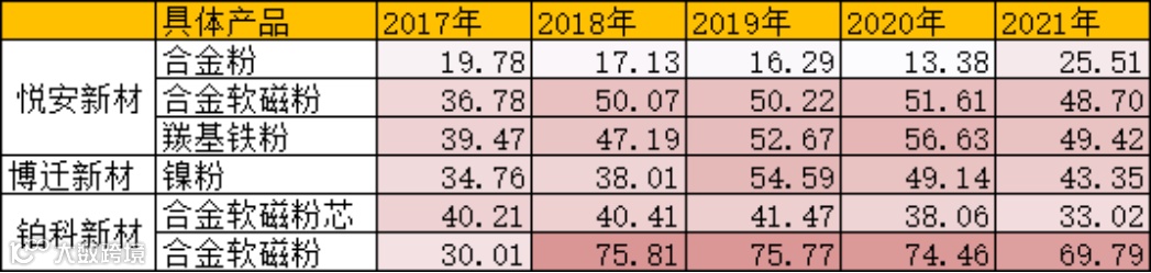 悦安新材,2021年相对另外两家公司毛利率提升1.5pcts,主要因为合金粉产品毛利率同比提升12pcts。原因是:1)优化了该类产品生产的工艺,生产出的雾化合金粉具有密度高、强度好、可塑性高、耐疲劳等特点,适合制作3C产品的外观件和结构件;2)3C产品,特别是其中折叠屏手机铰链对于高性能产品的需求。