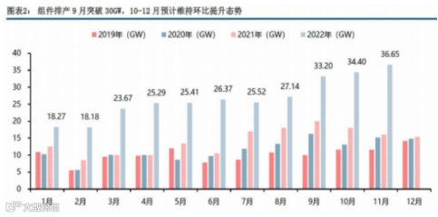 从排产情况来看,9月份组件单月排产首次超过30GW,10月环比提升4%,预计为Q4需求提前备货,11月排产预计在37GW,环比提升6-7%,主要是集中式电站需求增加。