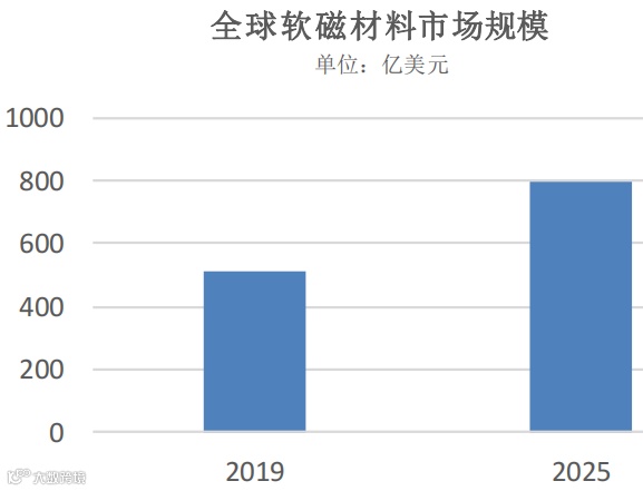 全球软磁材料市场规模具有较大增长空间。根据 BCC Research,2019-2024 年全球软磁材料市场的复合增长率将达到 9.10%,预计到 2024 年,全球软磁市场规模将从 2019 年的 514 亿美元升至 794 亿美元;而根据 IndustryARC 研究显示,2020-2025 年全球软磁市场规模年均复合增速为 9.2%,至 2025 年达到 791.7 亿美元。