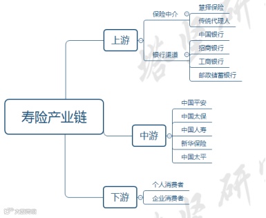 中游——寿险代表公司,有中国平安、中国太保、新华保险、中国人寿、太平保险、友邦保险等。