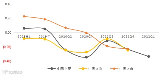 三、中国太保——2022Q1,实现营业收入1465.54亿元,同比-3.1%,保险业务收入1496.54亿元,同比+7.3%。归母净利润54.37亿元,同比-36.4%,主要受投资收益减少导致。