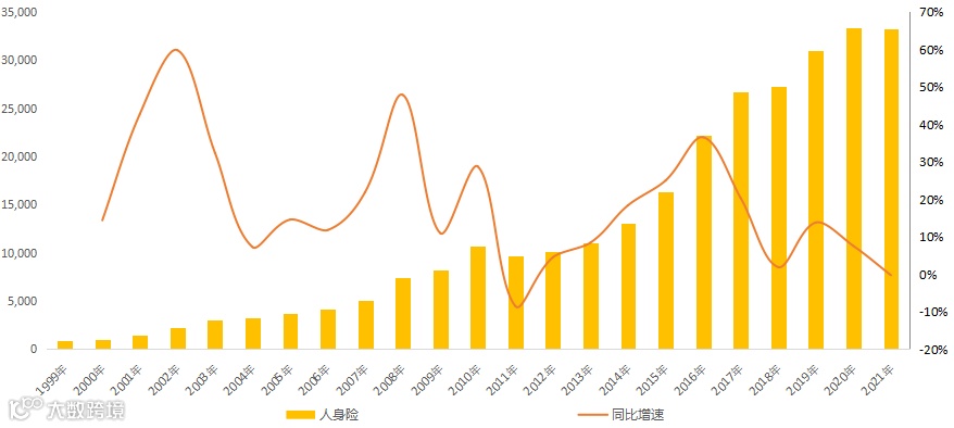 1999-2020年,人身险(以险种划分,包括财险公司人身险保费)保费的年均复合增速达19%。2021年,人身险原保险保费收入3.32万亿元,同比-0.3%,较去年同期下降7.8pt。