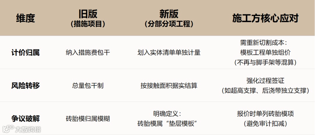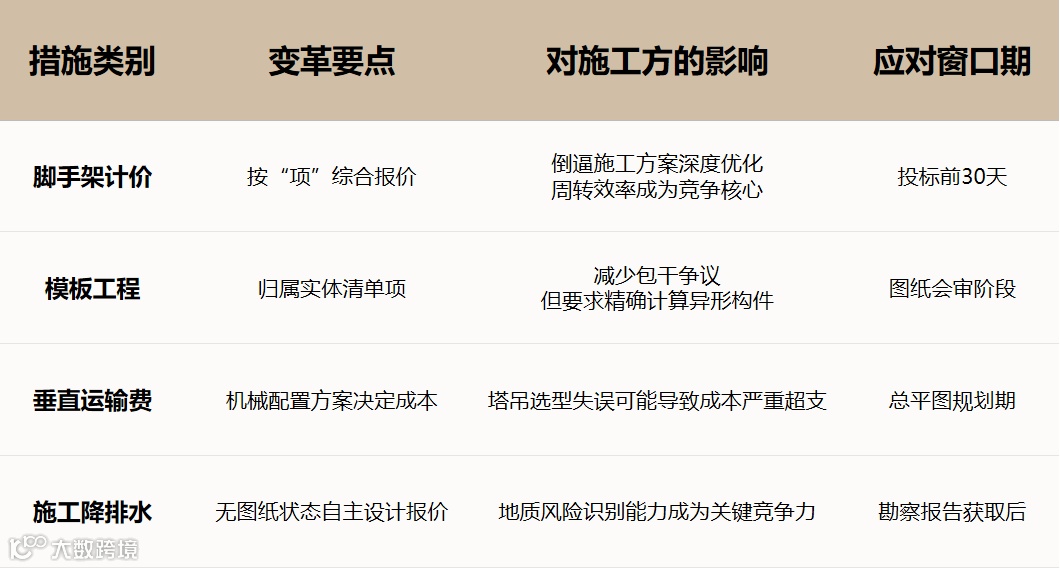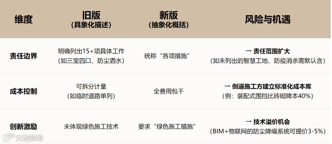 新版改“㎡/天”为 “项”计总价包干,施工方需通过专项方案证明费用合理性,重点把控: