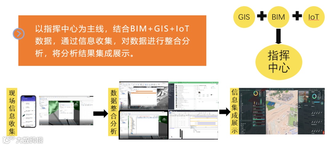 以指挥中心为主线,结合BIM+GIS+IoT数据,通过信息收集,对数据进行整合分析,将分析结果集成展示。