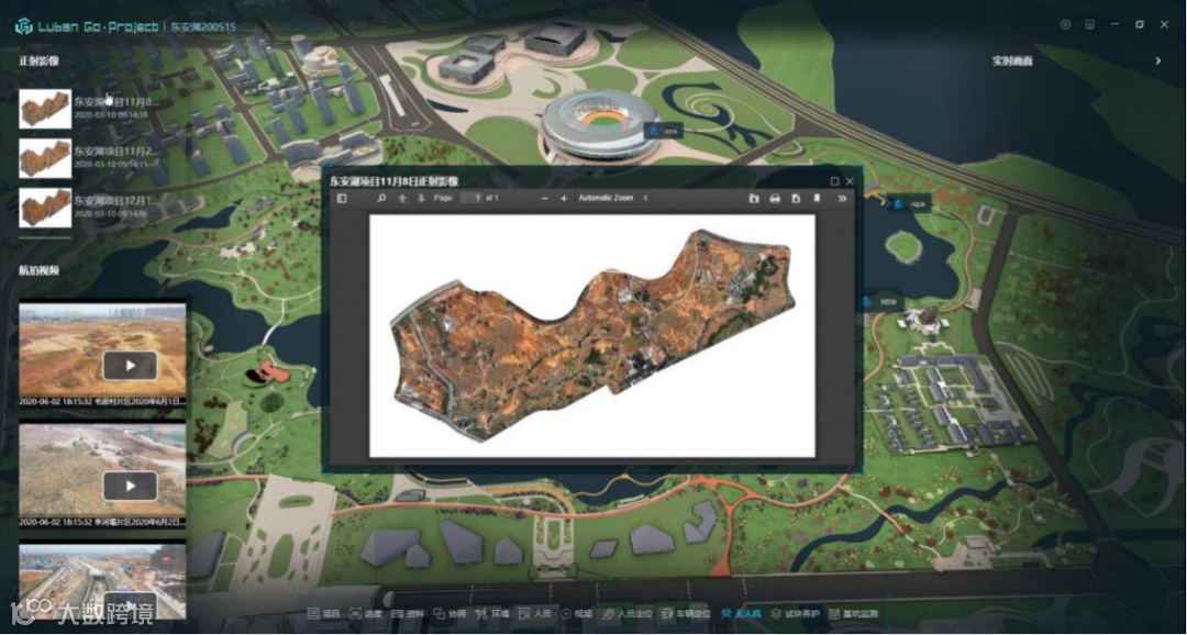 1.无人机巡航影像。无人机模块(如图15所示)集成了正射影像、倾斜摄影地形模型、土方填挖分析、航拍画面。通过实际土方挖填量与数字场景中土方挖填数据进行对比分析,完成了5次土方挖填方案优化;通过将无人机设备接入平台,定时定区域完成了86次自动巡航飞行;通过数字场景与航拍施工视频进行对比,直观展示项目进度。