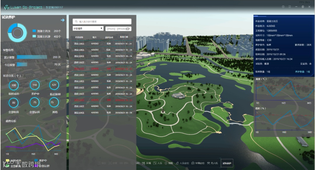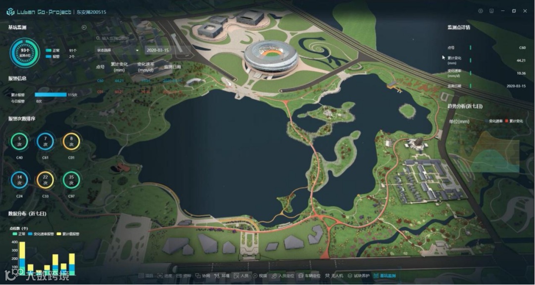 支持多源异构数据融合(多种主流BIM模型数据、GIS数据、倾斜摄影数据等)、多样数据服务、开放的数据接口;采用智慧建造施工管理平台完成工程项目5个示范区196.7公顷(hm2)公园景观高精度场景还原,建立无边界1:1的数字孪生虚拟场景;分级授权60余家单位、554个管理人员进行协同管理;通过智慧建造施工管理平台完成8个子系统的智慧物联网应用,对各项数据获取、分析,完成了预警推送不少于200次。