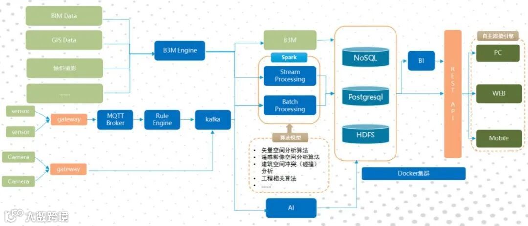 2.多源异构数据融合。整合了时空大数据和建筑大数据,提出一体化数字底板平台(如图5所示)。底层基于开源大数据引擎Spark、HDFS等,融入GIS、BIM相关分析算法,扩展了RDD(弹性分布式数据集)使之具备GIS、BIM专业特性,提供真正的数据融合与数据计算平台。