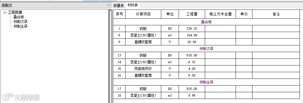 新增装配式-材料表,只展示预制柱、叠合板、预制主梁、预制次梁的混凝土体积、钢筋汇总量和套筒及预埋件的量