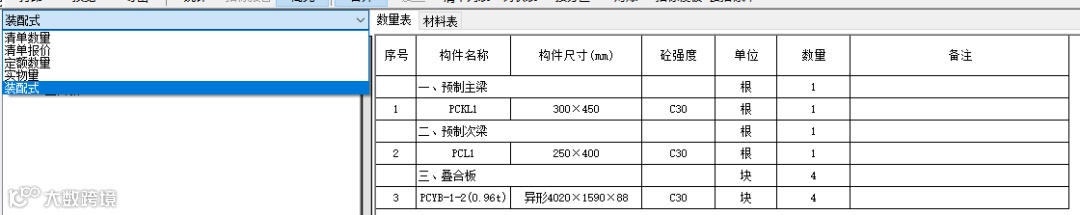 新增装配式-数量表,支持展示预制柱、叠合板、预制主梁、预制次梁的构件名称、构件尺寸、砼强度以及对应数量