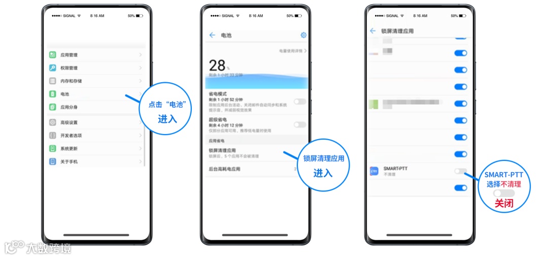 打开系统设置—电池—点击锁屏清理应用—找到SMART—PTT 把清理的选项给关闭。