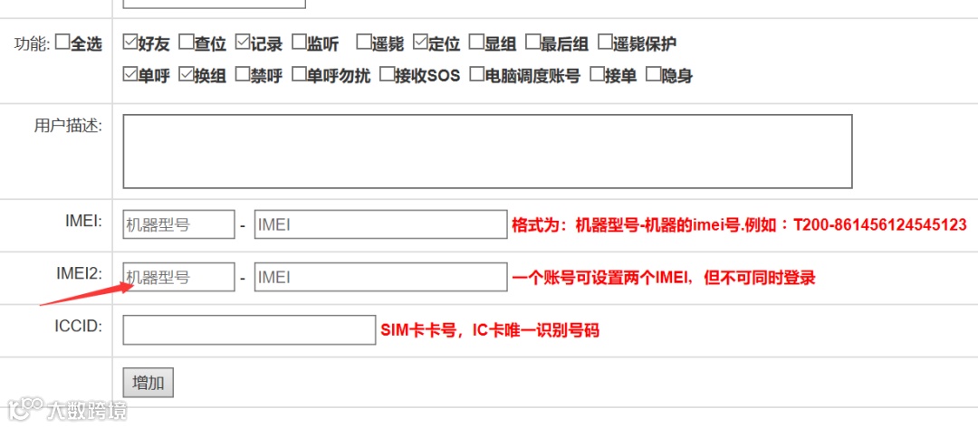 3. 企业平台用户新增可设置两个设备的IMEI号,但不可同时登陆。