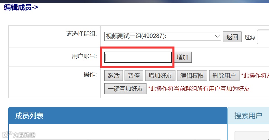 4. 企业平台群组管理->编辑成员,可将查询出来的用户一键加入群组。