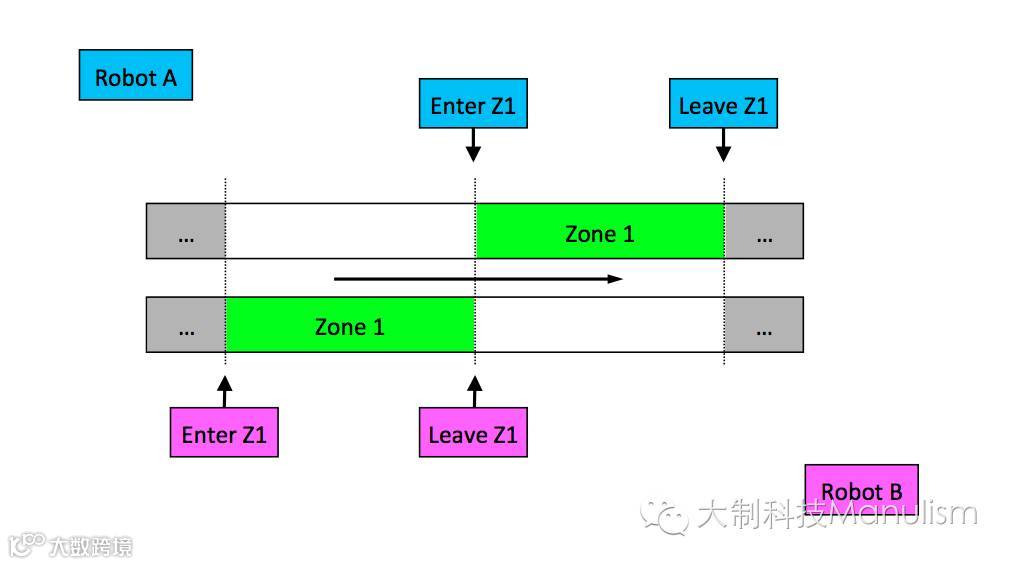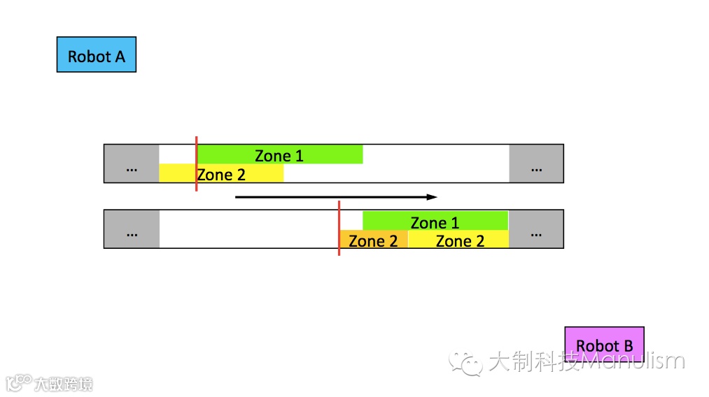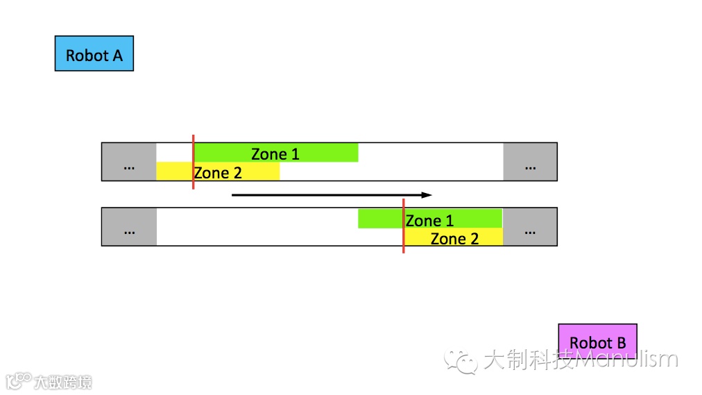 如下图,在正常时序时Robot A与Robot B都能正常运行,但当Robot A发生故障明显滞后于Robot B时就会发生互相等待进入新干涉区而互相锁死的状态。图示中Robot A在Zone2中请求进入Zone1,而同时Robot B在Zone1中请求进入Zone2。